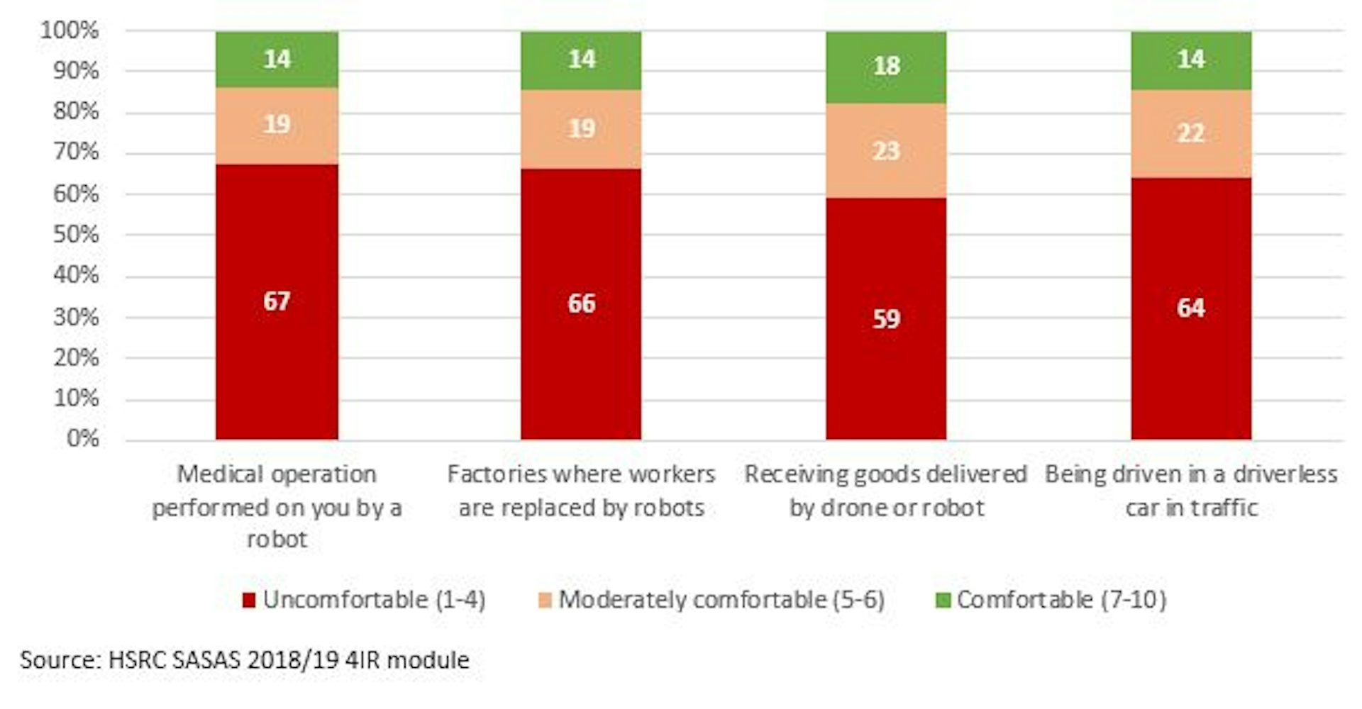 To gauge how culturally accepting South Africans are of technological change, respondents were asked to rate how comfortable they felt with four situations involving the use of robots: