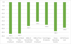 Employment also fell dramatically. Low-skilled, less-educated workers have been hit the hardest. The net effect is that the shocks are most severe on poorer, more vulnerable households.