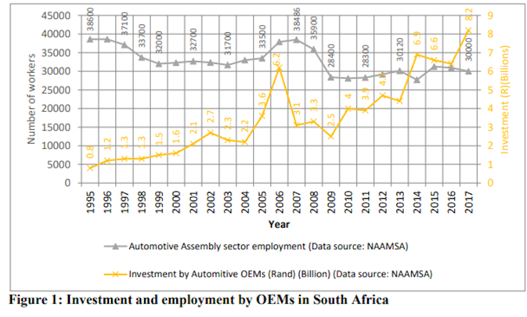 During the same period, investment by final vehicle companies, known as original equipment manufacturers, increased from R0.8 billion in 1995 to R8.2 billion in 2017.