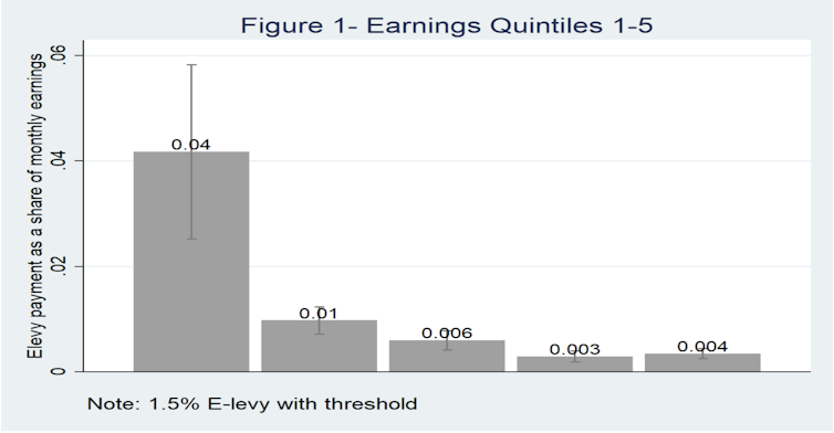 The lower rate brings a small degree of relief for the lowest earners. When the new e-levy rate (1%) is mapped onto our survey data, the lowest earning quintile would pay about 3% (instead of 4%) of their monthly earnings towards this tax, all else remaining equal.