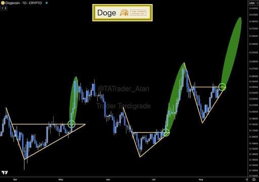 Dogecoin has been in the spotlight for years, and its loyal community has kept it alive through multiple cycles. Trading volume recently surged 30% in 24 hours to $3.5 billion, pushing price up 9.4% to $0.2456. Over the past week, Dogecoin has gained 22.4%, and analysts believe a move above $0.36 could trigger another leg up.