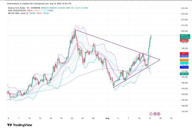 The Solana coin has delivered strong gains, jumping nearly 10% from $175 to over $201.15 after breaking through multiple resistance levels. Market sentiment is bullish, with traders watching the $202 and $205 levels closely. From a technical standpoint, the Solana coin has momentum, but like Dogecoin, it is already a top player.
