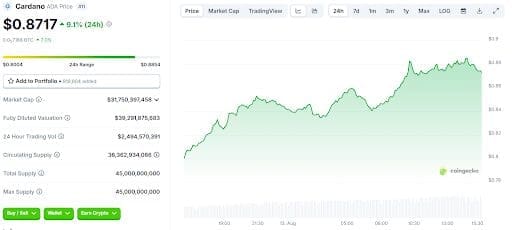 The Cardano price has been climbing steadily, fueled by ETF-related news and strong holder conviction. At $0.87, ADA is trading above its 20-day EMA and pressing against key resistance levels, potentially leading to $1.50–$2 targets.