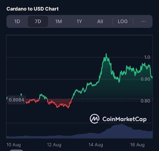 The Cardano price is trading at $0.908, which is slightly down from the $1 mark. The Cardano price is up by 11%, signaling a strong upward trend over the past week. The 24-hour trading volume is reaching around $3.5 billion.
