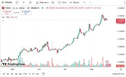 Tron, meanwhile, is traded at $0.3489, 0.09% lower over the same period. Market capitalization stands at $33.04 billion, with trade volume of $1.16 billion daily, reduced by 2.82%. Having good transaction throughput and consistent adoption aside, Tron is still lagging as competition in the blockchain industry intensifies.
