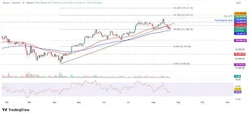 The Bitcoin price prediction has been mixed in recent days after BTC fell more than 8% from its all-time high of $124,747. Analysts like Ali Martinez warn that losing support at $112,000 could open the door to a deeper drop toward $108,000. For now, the $111,980 level remains the most critical support point. If it holds and BTC reclaims the 50-day EMA around $114,800, traders say a move back toward $116,000 and higher becomes possible.