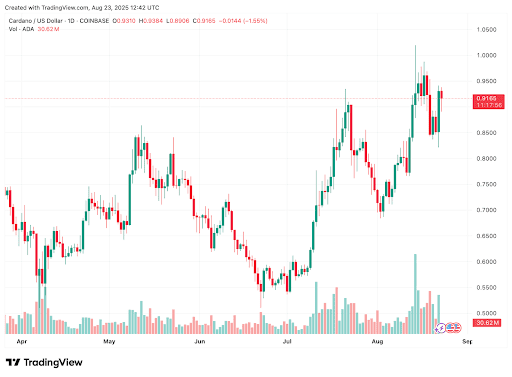 Support levels near $0.90 will be key in maintaining the upward trend. If ADA dips below this zone, it could test earlier consolidation levels, slowing its progress toward the $1 milestone.