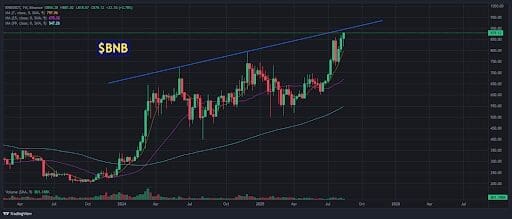 Other experts have revealed that despite BNB hitting a new ATH, it’s now approaching one of the strongest weekly trendline resistances in the $890–$920 zone. The BNB price prediction is that heavy short interest sits here and if price fails to break through, a sharp correction could follow.