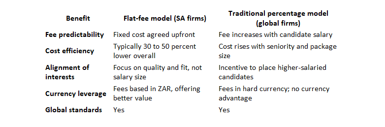 In a global industry dominated by the outdated norm of charging a percentage of a candidate’s total cost-to-company, South African executive search firms are offering international clients a compelling alternative: a flat-fee model that provides predictability, transparency, and significant savings – particularly for companies based in the US, UK, EU, and Australia.