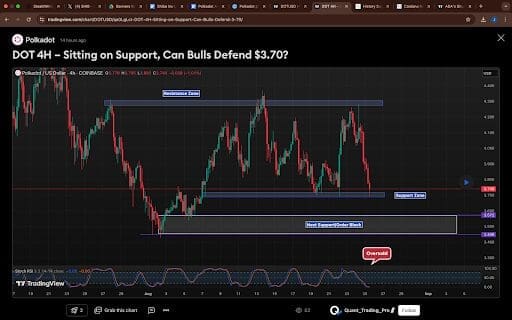 Polkadot latest news shows that DOT is currently trading around $3.77, moving in a tight range as the community debates supply and inflation changes. Despite some optimism from technical setups like a recent golden cross, DOT remains near its recent support at $3.70. Analysts are noting that if this level holds, a bounce toward $4.25 resistance could happen, but any breakdown below $3.70 may send DOT toward deeper support zones at $3.57 and $3.45.