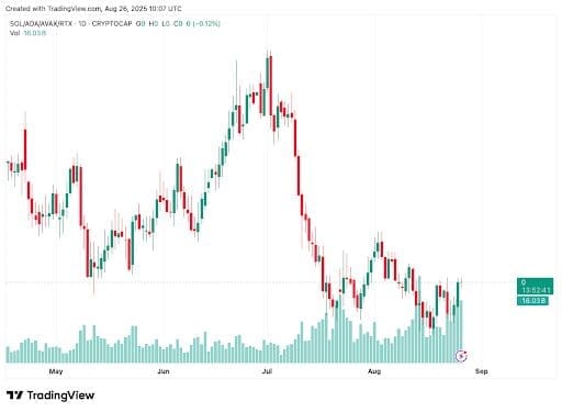 Avalanche (AVAX) has continued building momentum in subnets, gaming and enterprise applications. While adoption is growing, AVAX price action has been range-limited through August. Traders see it as a solid Layer 1 with consistent growth, but like ADA and SOL, its size limits the scope for exponential short-term returns.