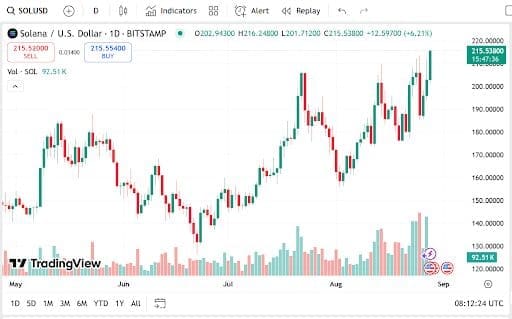 September has already been hectic for the crypto world, with Solana at $213.50 after rising 5.41%. Its capitalization is $115.44 billion while the daily trading volume was at $12.71 billion, up by 37.99%.
