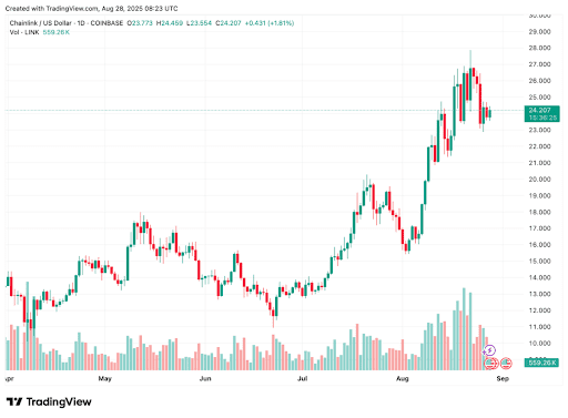 Chainlink’s price is around $24 after falling below the $25 support. While there’s been a dip, analysts remain cautiously optimistic, as LINK displays a rising channel with support around $23.5 on the price charts.