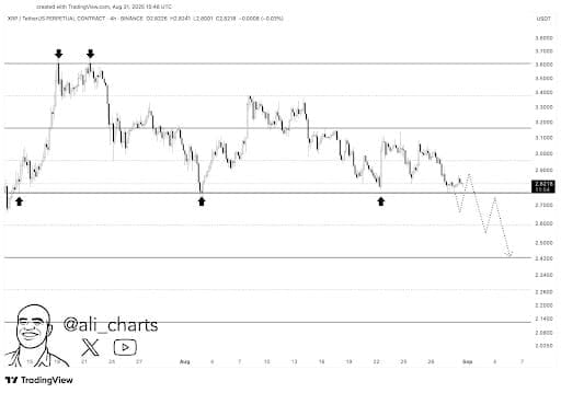 XRP continues to hold at $2.81, with analysts warning that a breach below this level could trigger a 10% slide toward $2.50 in September. The support level is a critical pivot. Experts say that XRP must hold above $2.77 to avoid a retracement to $2.40.