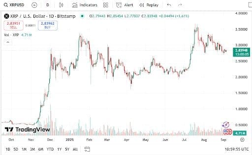 The XRP Price is currently capped at $2.83, 0.23% lower, while trading volume on a day-to-day basis rose 8.95% to $4.91 billion. At a market cap of $168.83 billion, XRP still reflects the issues that large-cap tokens are experiencing in gaining momentum.