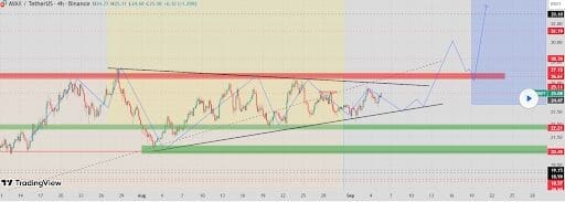 On the chart, AVAX is compressing under a 215-day range cap. If momentum fades, key supports sit near $22.00 and $21.00. Above those lines, bulls remain in control, and AVAX keeps a valid breakout case.