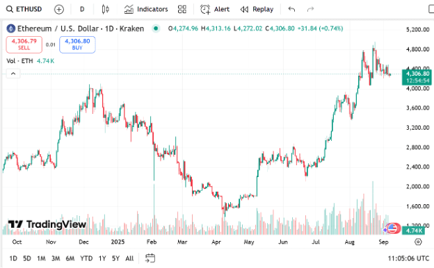 Ethereum remains one of the most influential cryptos, often dictating broader sentiment towards DeFi projects and low-cost gas fee crypto solutions. It is trading at $4,308.87, with a market capitalization of $520.13 billion, further cementing its status as a leader in the space. Transaction volume on a daily basis has dropped 47.95% to $19.35 billion, meaning that even the best assets experience slowdowns in the market.