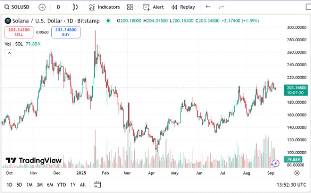 Solana Price is currently at $203.81, posting a steady gain of 0.67% on a day-to-day basis. Solana boasts a market cap of $110.44 billion and is still one of the largest players in the crypto space, cementing its place in DeFi, NFT, and blockchain high-performance applications.