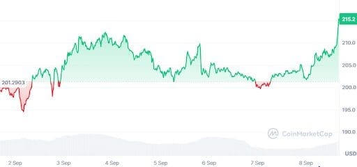 Solana (SOL) price is currently at $212 after it grew by 4% in the past day. Recent Solana price movement shows high intraday volumes with narrowing ranges. The 24-hour trading volume for SOL is up by over 111%.