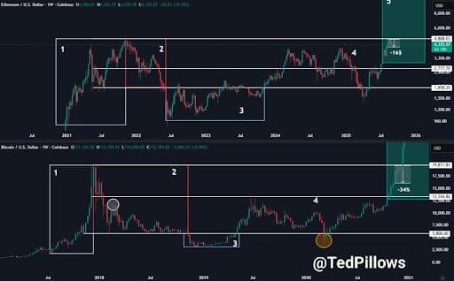 Ethereum has been under the spotlight in Q3, especially after its recent pullback. Market analyst Ted points out that ETH is moving in a pattern almost identical to Bitcoin’s last cycle.