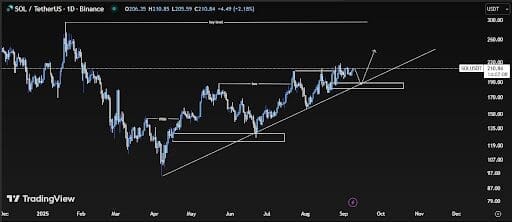 Meanwhile, market watcher Crypto General pointed out that Solana is holding a strong demand zone near $190, with the next key area between $240–$260.