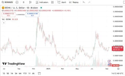 Bonk coin has remained a community-driven meme token, renowned for its viral strength but no infrastructure usefulness. Its current selling price is $0.00002341, and its market capitalization is at $1.89 billion. Its trading volume is down slightly by 1.24% to $284.05 million, marking a short-term drop in speculation.