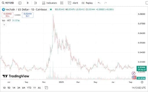 Meanwhile, VeChain still has the reputation of supply chain technology and blockchain adoption. Its market capitalization is $0.02455, and its market value is $2.11 billion. The volume decreased by 7.06% to $45.61 million, a reminder of the enduring adoption challenges despite its good ecosystem presence.