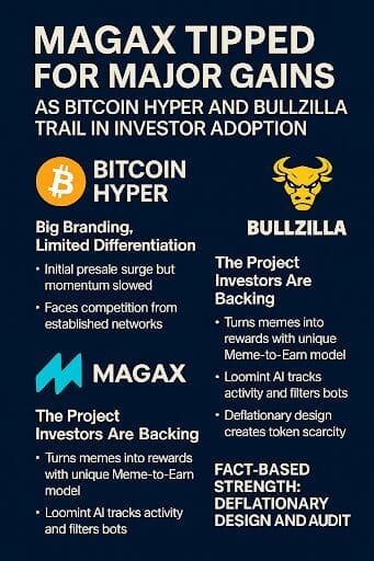 Bitcoin Hyper and BullZilla have both attracted early headlines, but as adoption patterns take shape, investors are signaling a clear preference for MAGAX. The reason is simple: it combines meme culture with deflationary tokenomics and AI-powered rewards, making it far more than another speculative coin.