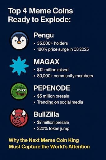 Four meme coins—Pengu, MAGAX, PEPENODE, and BullZilla—have stepped onto the track, each with their own fuel. But in a contest of creativity, innovation, and community power, only one coin has the formula to outpace the rest.