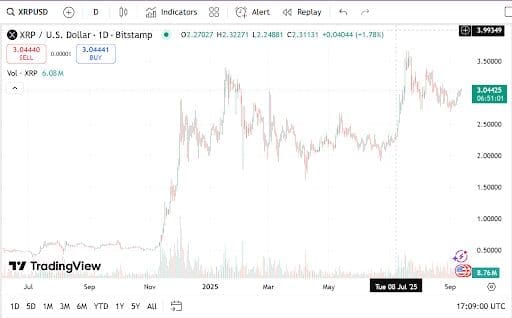 The XRP Price today sits at $3.04, reflecting a modest gain of 0.89%. With a market capitalization of $180.39 billion and daily trading volume at $5.21 billion, up 5.3%, Ripple continues to hold a strong position in the broader crypto market. These figures keep XRP among the most talked-about tokens in 2025, especially as institutional flows and global adoption trends shape the narrative around digital payments.