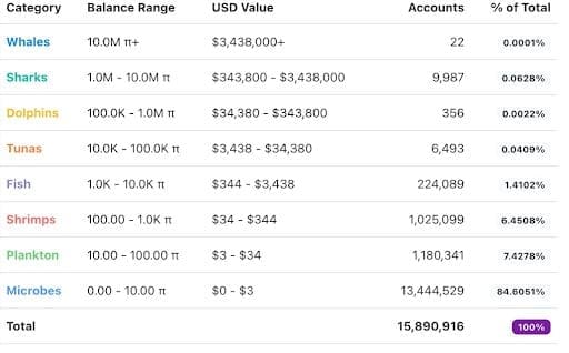 Further down the hierarchy, the numbers become larger but the value drops significantly. Tunas, holding between 10,000 and 100,000 Pi, number in the thousands. Their balances equate to $3,400 to $34,000 at today’s prices.