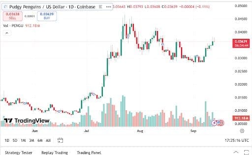 Similarly, Pengu is now in the spotlight, standing at $0.03638, with a $2.28 billion market capitalization and $546.56 million in daily trade volume. Both remain speculative tokens that survive on community hype and liquidity on decentralized platforms.