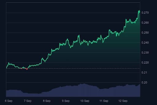 Dogecoin is holding steady around $0.27, after surging nearly 6% in anticipation of the first U.S. Dogecoin ETF, “DOJE,” set to begin trading soon. Between that expectation and heavy trading volume, DOGE has cleared some short-term resistance, yet the $0.29 resistance zone remains a sticking point. Technicals suggest that if DOGE can sustain closes above $0.26, momentum could carry toward $0.30 in the near term.