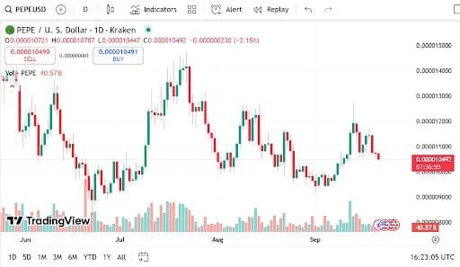 Pepe Coin also has a space in the meme coin territory, available for trading at $0.00001049 and a market capitalization of $4.43 billion. Its trading volume of $399.41 million went down by 17.83%, but Pepe Coin remains one of the strongest cryptos under $1 to watch.