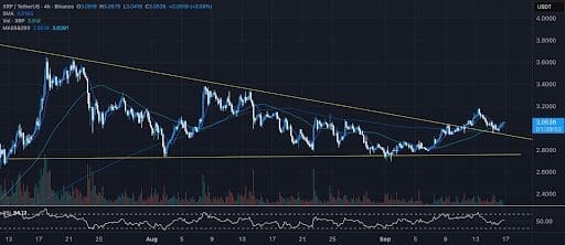 The four-hour chart showed XRP pushing through a restrictive barrier after its July peak at $3.66. Several failed attempts kept it capped until it bottomed at $2.69 on September 1. Since then, it has reclaimed $3.00 and is trying to hold this area.