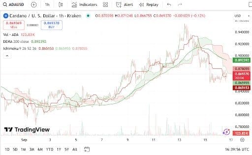 The ADA Price is currently trading at $0.8643, a moderate 0.58% increase in 24 hours. The coin’s market capitalization is $30.92 billion, a reflection of its strong presence in the market. The 24-hour trading volume, however, has taken a nosedive, down 32.63% at $1.28 billion, ringing alarm bells of reduced liquidity.