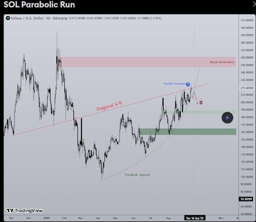 Technically, analysts note that since the April crash, Solana has been building a definite structure with successively higher lows in a parabolic trend and consistent resistance along a diagonal S/R level that used to serve as support.
