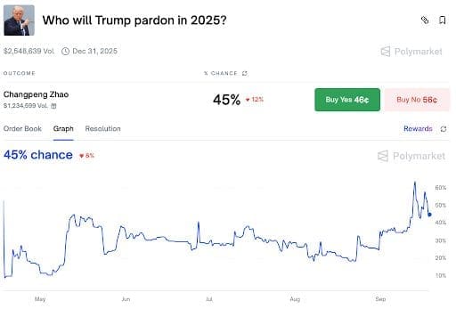 The surge in Polymarket bets on CZ’s return has become one of the most-watched narratives in Binance news in 2025. Traders on the prediction market pushed the odds of a pardon for Changpeng Zhao to above 60% before settling near 45%.
