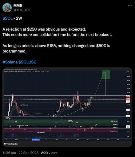Analysts say rejection at $250 was no surprise, with more consolidation needed before another breakout. They still expect SOL hitting $500 down the road, but a 3,000% surge is more fantasy than forecast.