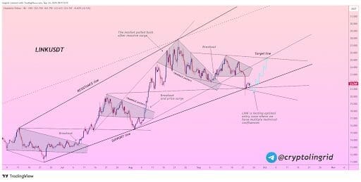 LINK is currently trading near $21.8. According to crypto analyst Lingrid, the current retest around the $21–22 area aligns with strong channel support and past breakout levels. If this base holds, bulls could push LINK toward the $25–27 resistance cluster in the coming days.