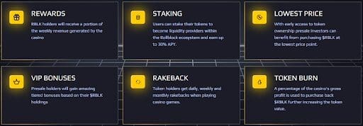 What really sets Rollblock apart, however, is its revolutionary tokenomics model. Each week, up to 30% of the platform’s revenue is reinvested into systematic RBLK buybacks. Of that, 60% of tokens are permanently burned, creating a deflationary environment that will allow the price to rise sustainably. The remaining 40% is distributed to holders as staking crypto rewards, offering both passive income and exponential appreciation potential.