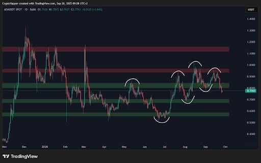 The Cardano price is holding steady at around $0.79, finding support at $0.82 and facing resistance near $0.95. Analysts suggest ADA could reach $1.10–$1.20 if momentum builds in the next rally.