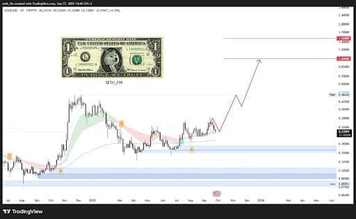Dogecoin’s chart is flashing a golden cross signal, one of the most-watched bullish indicators. After rebounding from $0.2223, DOGE quickly climbed to $0.285 before facing resistance. The Dogecoin price prediction now points to the $0.30 mark as the key level to beat, with some analysts eyeing higher targets at $0.39 and $0.45.