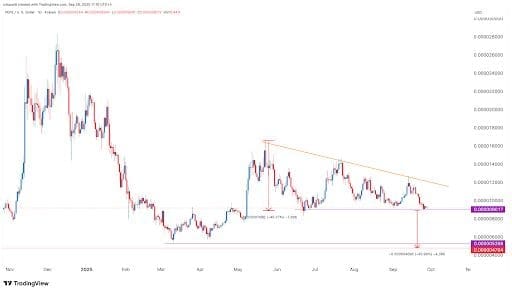 Technical indicators show PEPE Coin Price Prediction stuck in a risky zone. The token has fallen more than 45% from its 2025 peak, testing lows near $0.000009017. Chart structures point to a descending triangle, which could trigger another 30% decline if support at $0.0000052 fails.