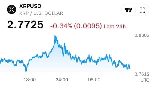 XRP trades at $2.77 after slipping 2.1% in the past 24 hours. Support is visible near $2.69, while resistance caps upside around $2.83. Analysts say a breakout could take price toward $3.10, but confidence remains tied to legal clarity and potential ETF approvals.