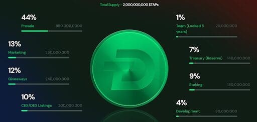 At its core, $TAP is structured with clear tokenomics, including 124% APY for staking and a buyback and burn system designed to reduce supply.