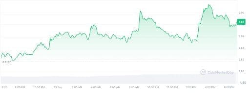 XRP is up 4.27% to $2.88 but can’t break $3.00, staying between $2.86 and $2.91. Resistance is at $3.20-$3.64, with support at $2.71.