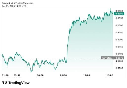 Cardano (ADA) is trading around $0.84, just above its central support zone near $0.80. Analysts tracking the ADA Price believe the token is still in its accumulation phase, with upside potential into Q4. If the market maintains current liquidity levels, ADA could test $0.90 in the coming weeks, though major breakouts may require stronger network inflows.