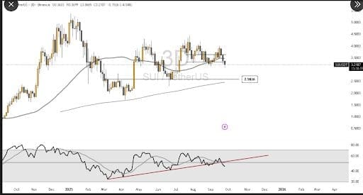 Sui trades around $3.15 after defending key $3.10 support. Analysts point to a bullish pennant trend that has its resistance at the level of $3.50-$3.60. A breakout of this band could create a way to $4.50 and even $5.35. More so, Sui has the potential to experience a massive mean-reversion rally with the Relative Strength Index being close to overbought.