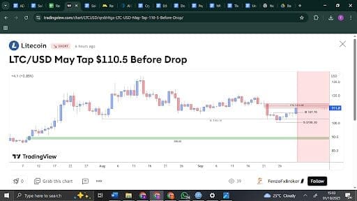 Litecoin (LTC) trades around $110 today, riding a fresh burst of interest as spot-ETF odds rise and liquidity improves. Correlation to Bitcoin remains high, which many funds still prefer during volatile rotations. If approvals and flows align, bullseye a push toward and above the $120 area.